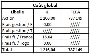 Une repas coûte 0,50 € soit 328 F CFA, le budget s’élève donc à 1 200 € soit 787 149 F CFA.